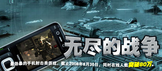 ◆ 无尽战争是一个在GSM/3G流动电话线上执行的大型多人对战游戏,结合了流动网路技术及线上游戏精粹,使线上游戏流动化,每个服务器能容纳过千人同时在任何地点进行对战或国战。