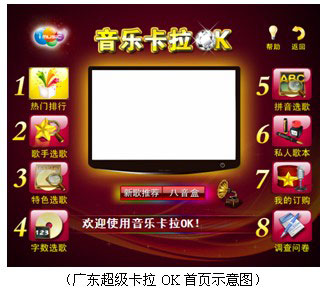 超级卡拉OK产品在电视上,可以实现按热门排行、歌手、乐队、特色类型、字数、首字母、拼音等点歌方式进行点歌,并支持原/伴唱切换、切歌、播放列表、透明方式点歌、歌曲收藏、快捷键、表情符号等高级功能。